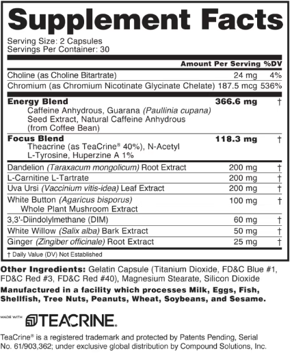 Sustains Energy* Formulated with 283 mg of Caffeine (almost 3 cups of coffee) per 2 capsule serving. If that’s too much, bump it down to 1 capsule for the perfect amount of fire to drive your day.