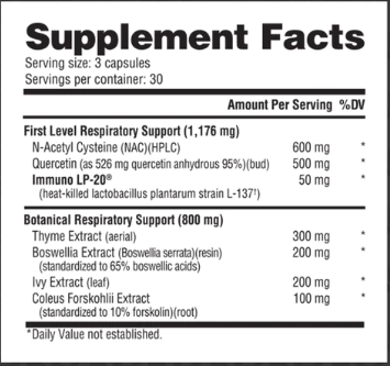 Lungs is a respiratory support formula for optimal lung health. The main ingredient is Immuno-LP20 (Lactobacillus Plantarum): Lactic-acid bacteria commonly found in a wide variety of fermented foods. It also includes supporting ingredients NAC, Quercetin, Thyme Extract, Boswellia Extract, Ivy Extract & Coleus Forskohli.