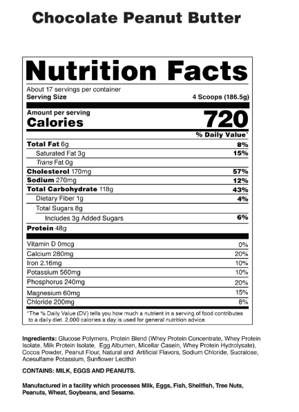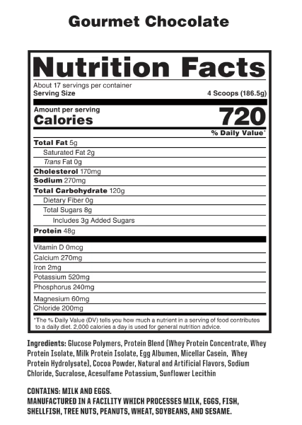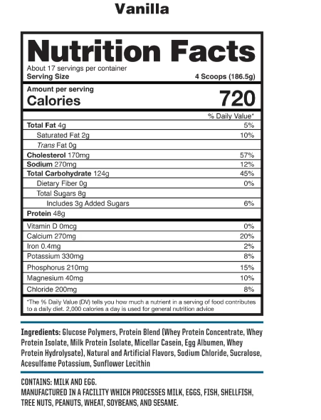 - Mass Gainer: Helps to increase mass size with 720 calories per serving and carb load with 118g - 124g of carbs per serving.