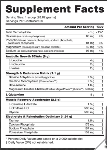 - Loaded with 21g amino acids, 8g BCAAs, 5g glutamine, and 3g creatine