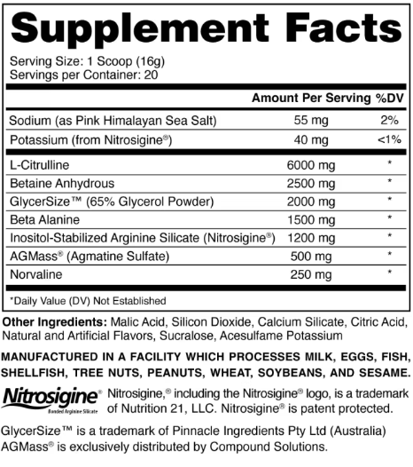 L- Citrulline, Betaine Anhydrous, GlycerSize™ Beta Alanine, Nitrosigine ® , AGMass™ and Norvaline combine to offer you over 13 grams of pump and performance activators.*